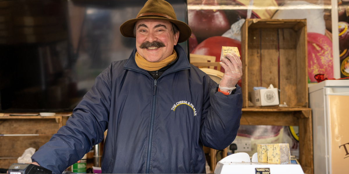 Cheese seller pictured holding cheeses at his stall
